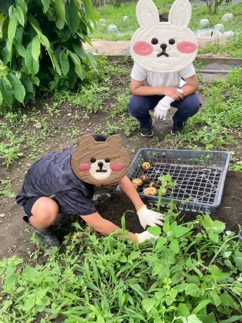 今日は畑のじゃがいもを収穫しました。参加者は小学生4名と中学生1名と少し少なかったかな・・