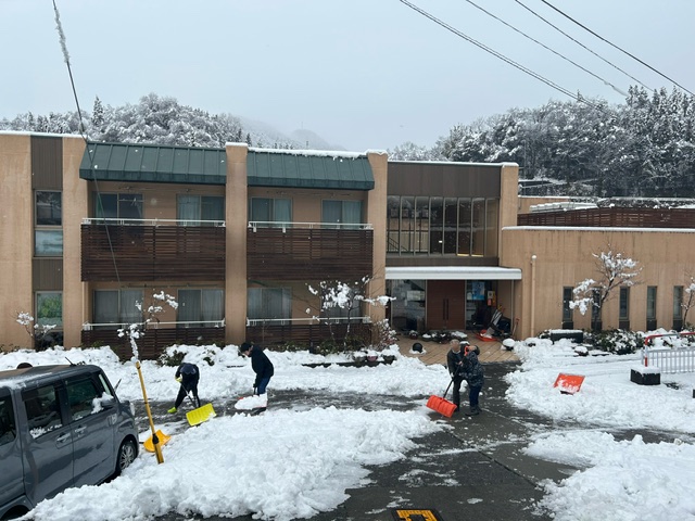 - 明日の登校でみんなが転ばないように通学路を雪かきです