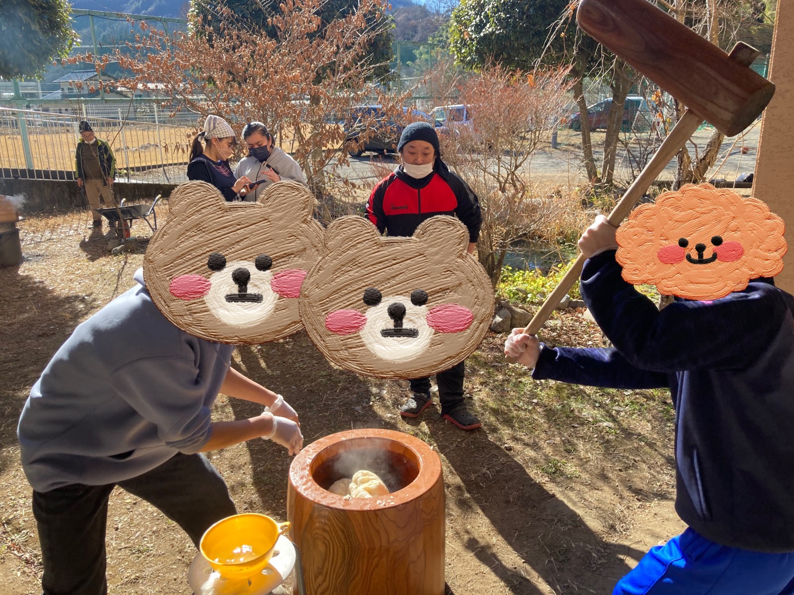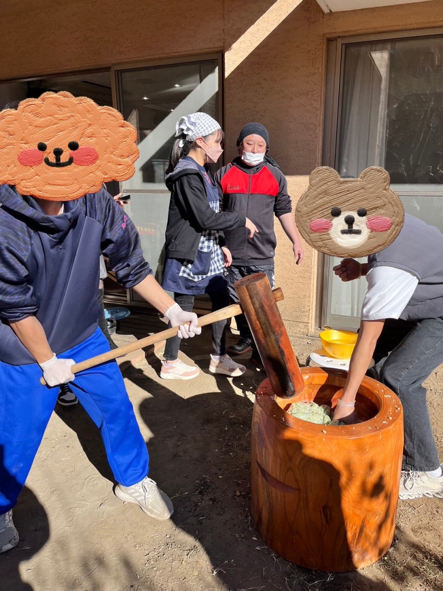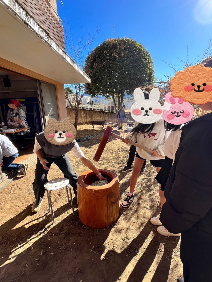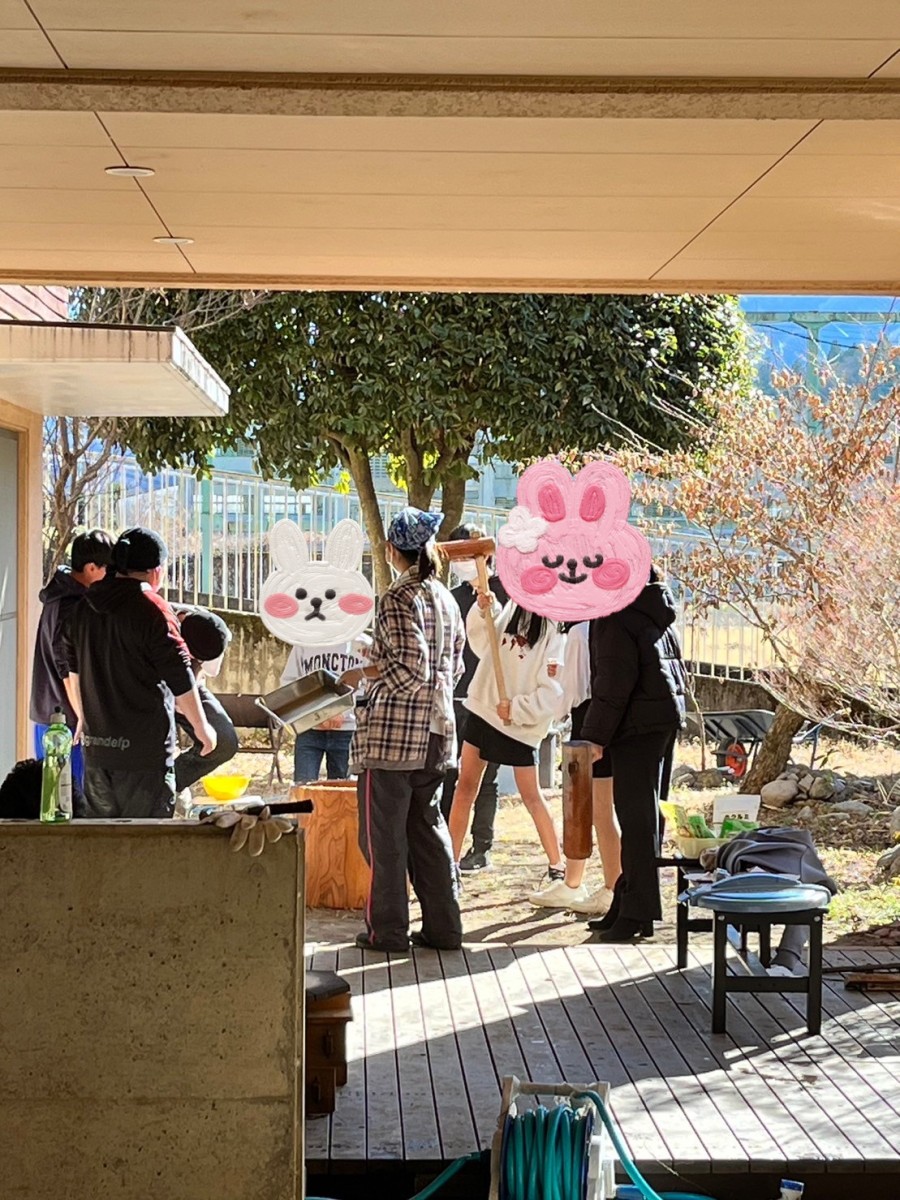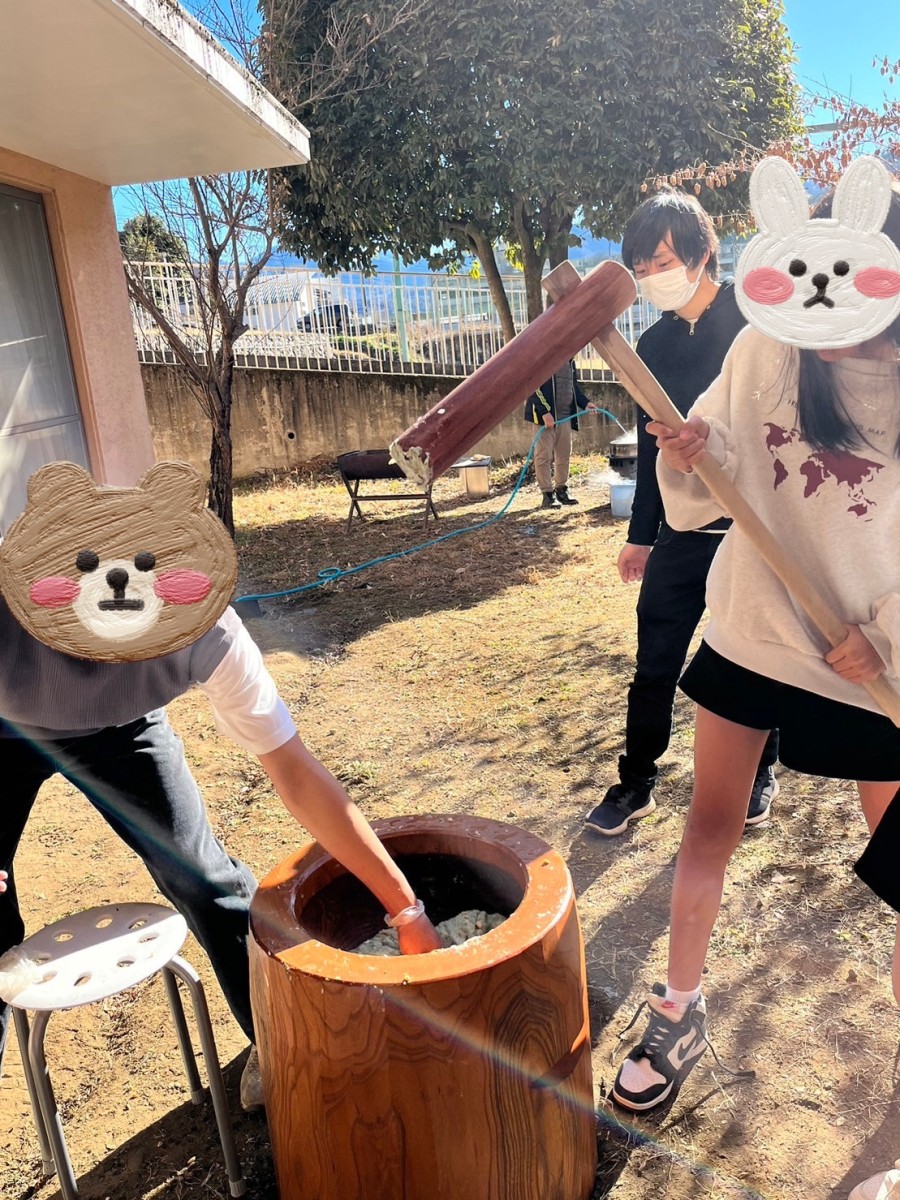 今日は毎年恒例のもちつきをしました。新型コロナウイルス、インフルエンザの流行もあり地域の方を招いての行事としての開催は見