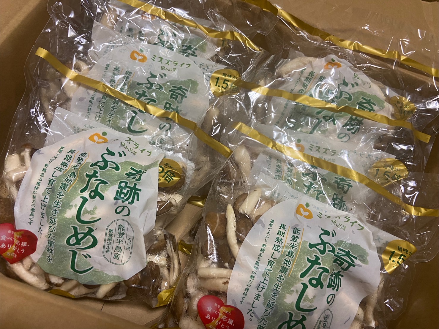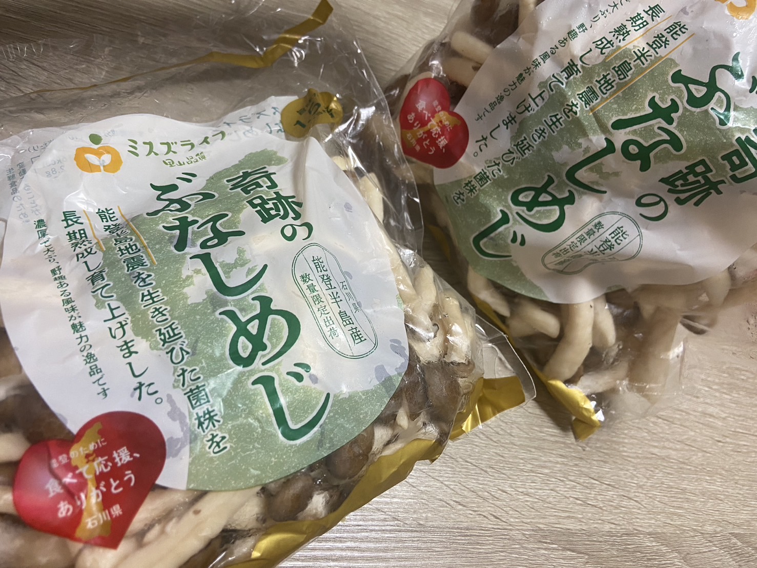 パッケージには「奇跡のぶなしめじ」とあり、2024年に能登半島を襲った震災による影響を受けたミスズライフ能登工場の復旧活動