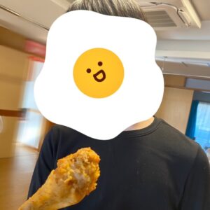 - チキンを持ってクールな表情で