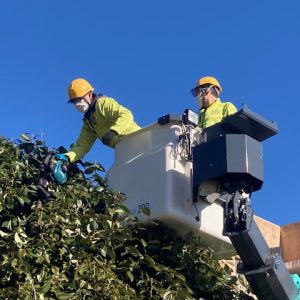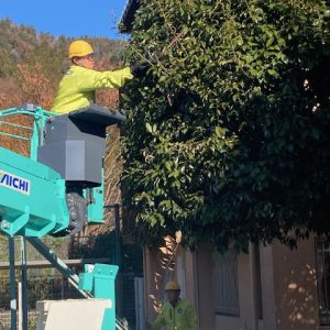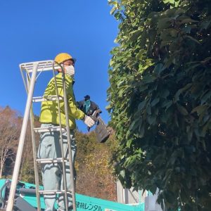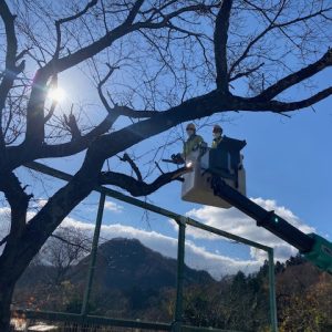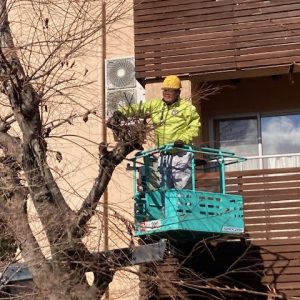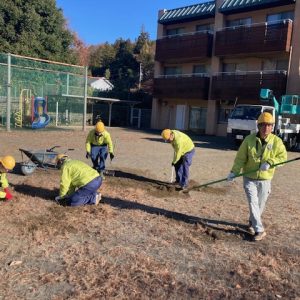 園庭に高くそびえ立つ木々の枝打ちや、園庭と周辺の草取り、園庭に砂を入れての整地作業をお願いしておりますが、高所作業車などを駆使して毎年