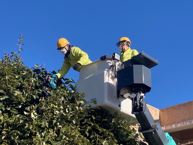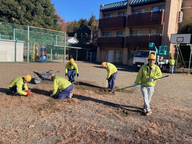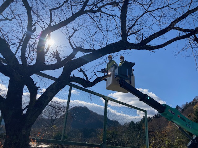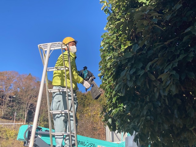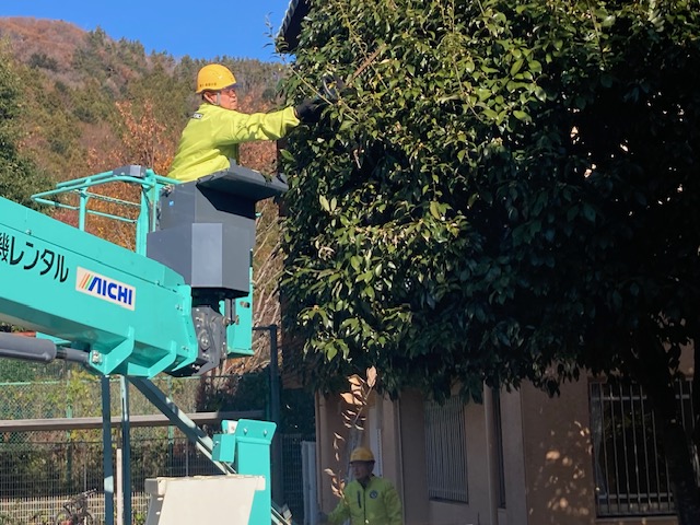 園庭に高くそびえ立つ木々の枝打ちや、園庭と周辺の草取り、園庭に砂を入れての整地作業をお願いしておりますが、高所作業車などを駆使して毎年