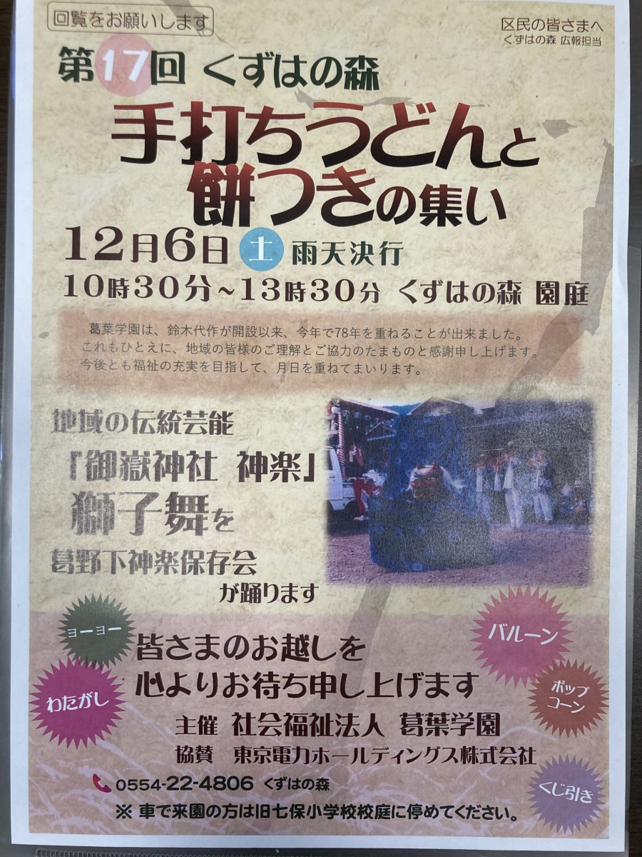 12月6日(土)毎年の恒例行事であります、「手打ちうどんと餅つきの集い」を開催いたします。
