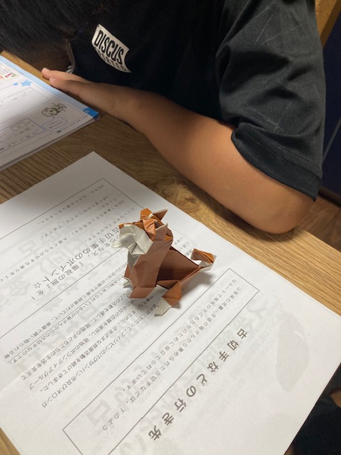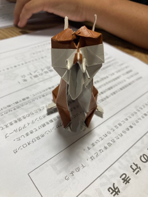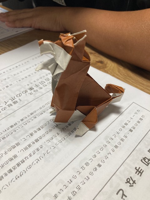折り紙ってすごいね 2025/11/02 ハイクオリティー ー令和7年11月1日ー 手先が器用で折り紙好きな小学校6年生の男の子。 男の子なのに折り紙って・・と思うかもしれませんが、大人向けの折り紙の本を買って研究するほど。 難易度レベルが高い「犬」の作品は作るのがとても大変。職員もその工程を見て逃げ出すような作品ですが、ついに完成させたようです! 1枚の紙から作り上げるなんて、すごいです! 正面から 横から見ると クオリティー高いです!