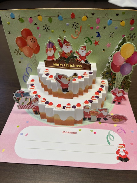 東京都の門司一徹様より、クリスマスカードをいただきました 2025/12/23 ー令和7年12月22日ー 東京都の門司一徹様より、クリスマスカードを贈っていただきました! 長年に渡っての贈り物をありがとうございます。 可愛いクリスマスカードに、子ども達も胸を躍らせることと思います。 今年も可愛いカードが届きました! 飛び出すタイプで素敵! 門司一徹様からのご支援に感謝申し上げます。