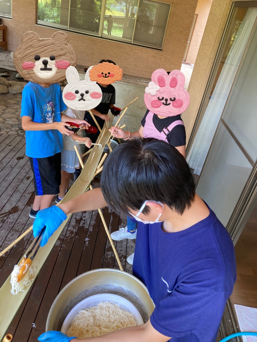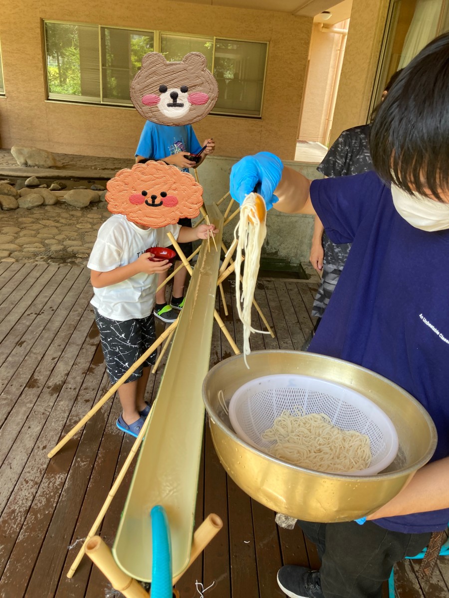 流しそうめんをしました! 2023/09/02 流しまーす! ー令和5年9月2日ー 今日は流しそうめんをしました。天然の竹を準備したかったのですが、今年は良い状態の竹が手に入らなかったので、天然風の道具 を使っての流しそうめんです。初めて体験する子どももいる中で場所の取り合いになるかと思いきや、年下の子どもが食べられるよう に気遣いをしてくれる子ども達の様子にほっこりしました。