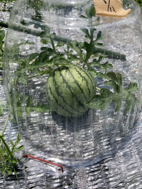 に、いつもドーム型のカバーをしているのですが、今日様子を見に行くと、一番大きくてもう少しで収穫を迎えるはずのスイカのカバ