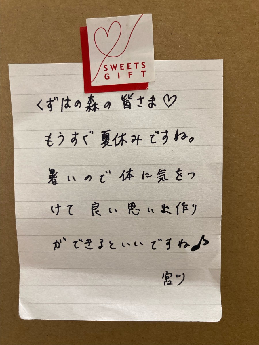 甲府市の宮川浩子様より、お菓子をいただきました 2024/07/18 ー令和6年7月15日ー 甲府市の宮川浩子様より、子ども達にお菓子をいただきました。 日頃より、子ども達のためにご支援をいただいております。ありがとうございます! これから始まるなが~い夏休みを、病気やケガもなく元気に過ごしたいと思います。 いつもメッセージをありがとうございます たくさんのお菓子をいただきました 写真に納まりきらないほど!