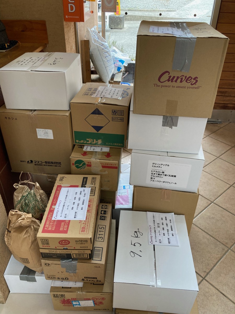 登り坂石油株式会社カーブス事業部の梶原様・原田様がカーブス都留の会員の皆様からの食料品を、フードドライブで届けてくださ