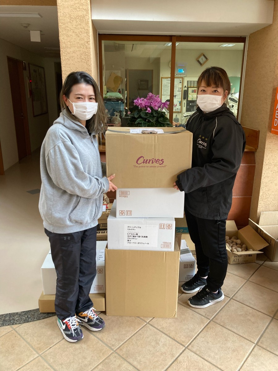 - 登り坂石油株式会社カーブス事業部の梶原さんと原田さんが届けてくださいました