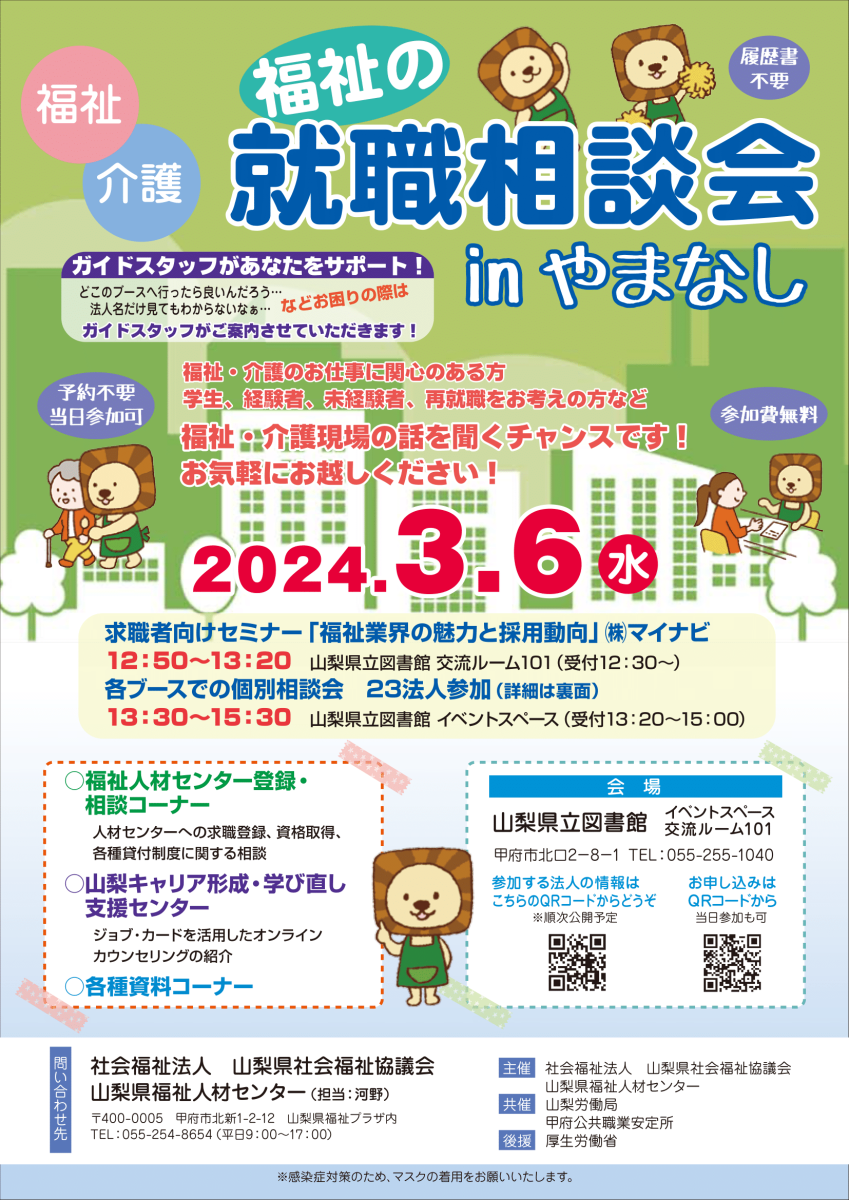 福祉の就職相談会に参加します! 2024/02/29 興味のある方はご参加ください ー令和6年2月29日ー 令和6年3月6日(水)の13:30より山梨県立図書館にて、山梨県福祉人材センターが主催する「福祉の就職相談会in山梨」に参加する 予定です。福祉のお仕事に興味がある方は是非ご参加ください。私達も令和6年度の採用に向けて、素敵な方と巡り合うことができれ ばと思い参加をさせていただきます。当日興味のある方ブースにお越しいただければ嬉しいです!