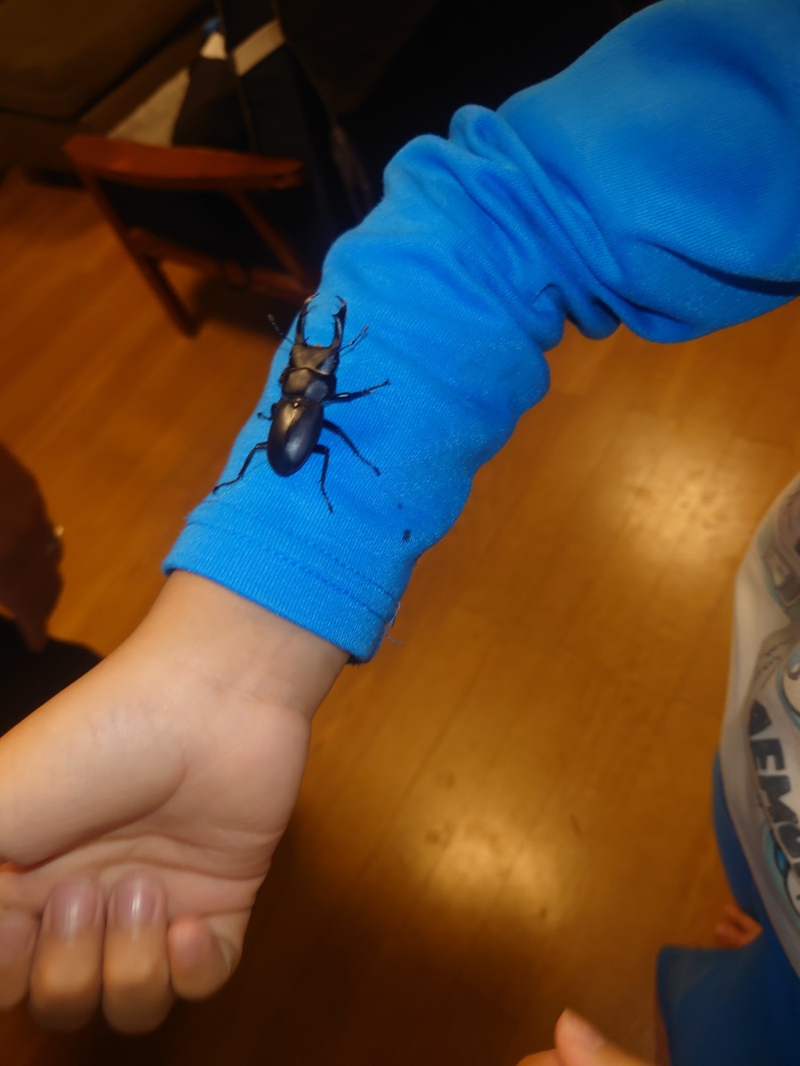 先日、施設長が子どもが喜ぶとクワガタを持ってきてくれたのですが、おっかなびっくりで勇気をだして腕にのせてました(^o^)