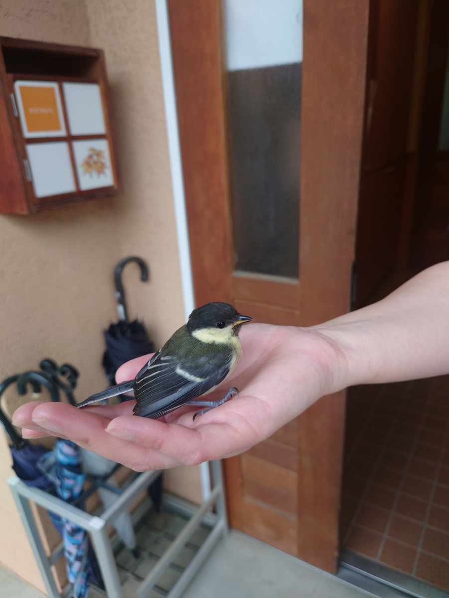 朝、掃除をしているとシジュウカラの若どりが部屋に迷い込んできたので外に放してあげました。