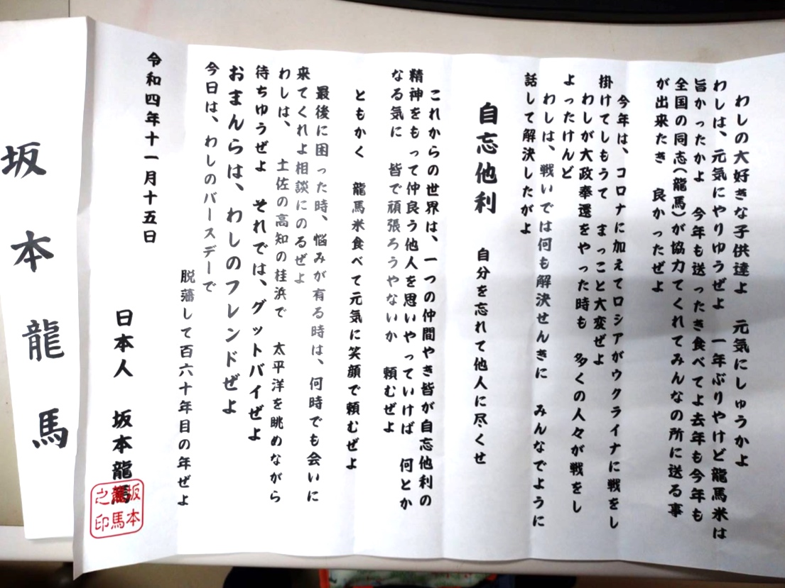 高知県の坂本龍馬様から、お米をいただきました 2022/11/15 龍馬さんおおきに! ー令和4年11月14日ー 高知県高知市の坂本龍馬様より、お米を贈っていただきました。美味しいお米をありがとうございます。龍馬さんに感謝申し上げます。「おおきに!」 龍馬さんからのお手紙も添えられていました。
